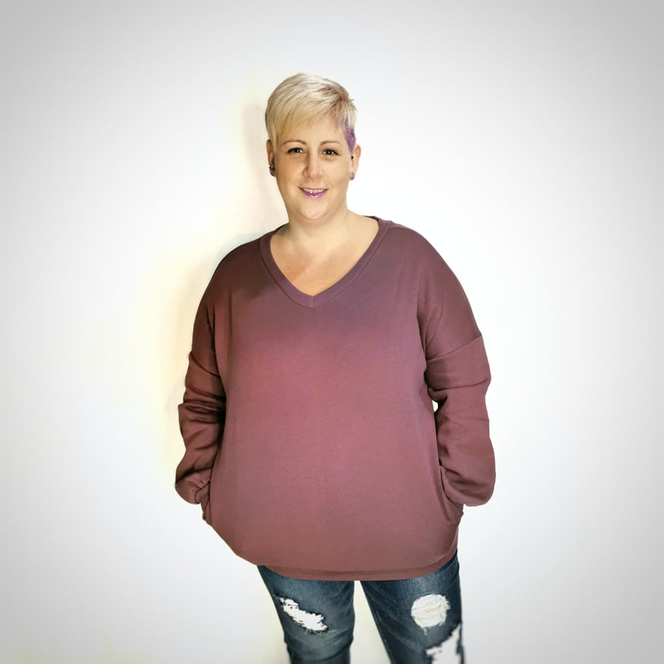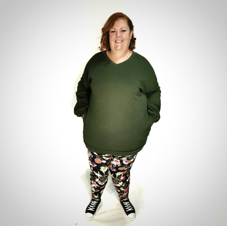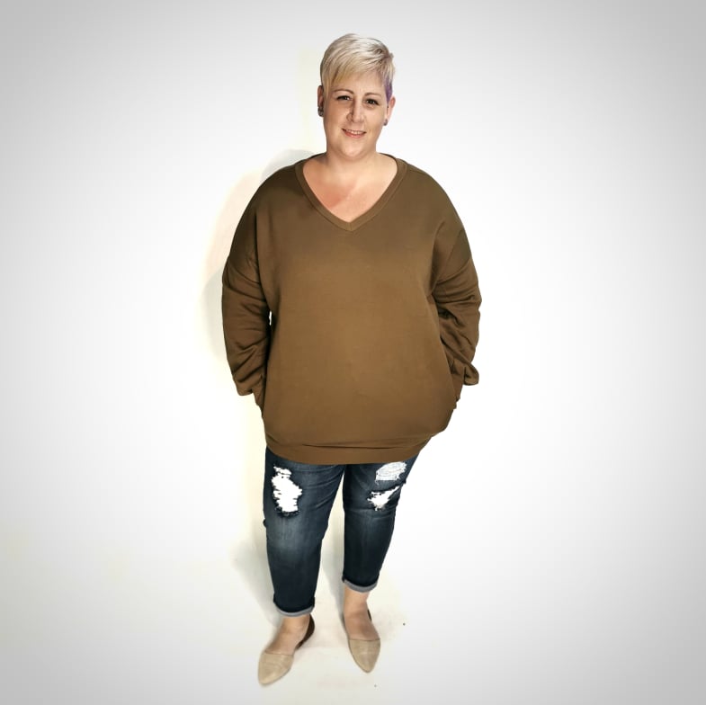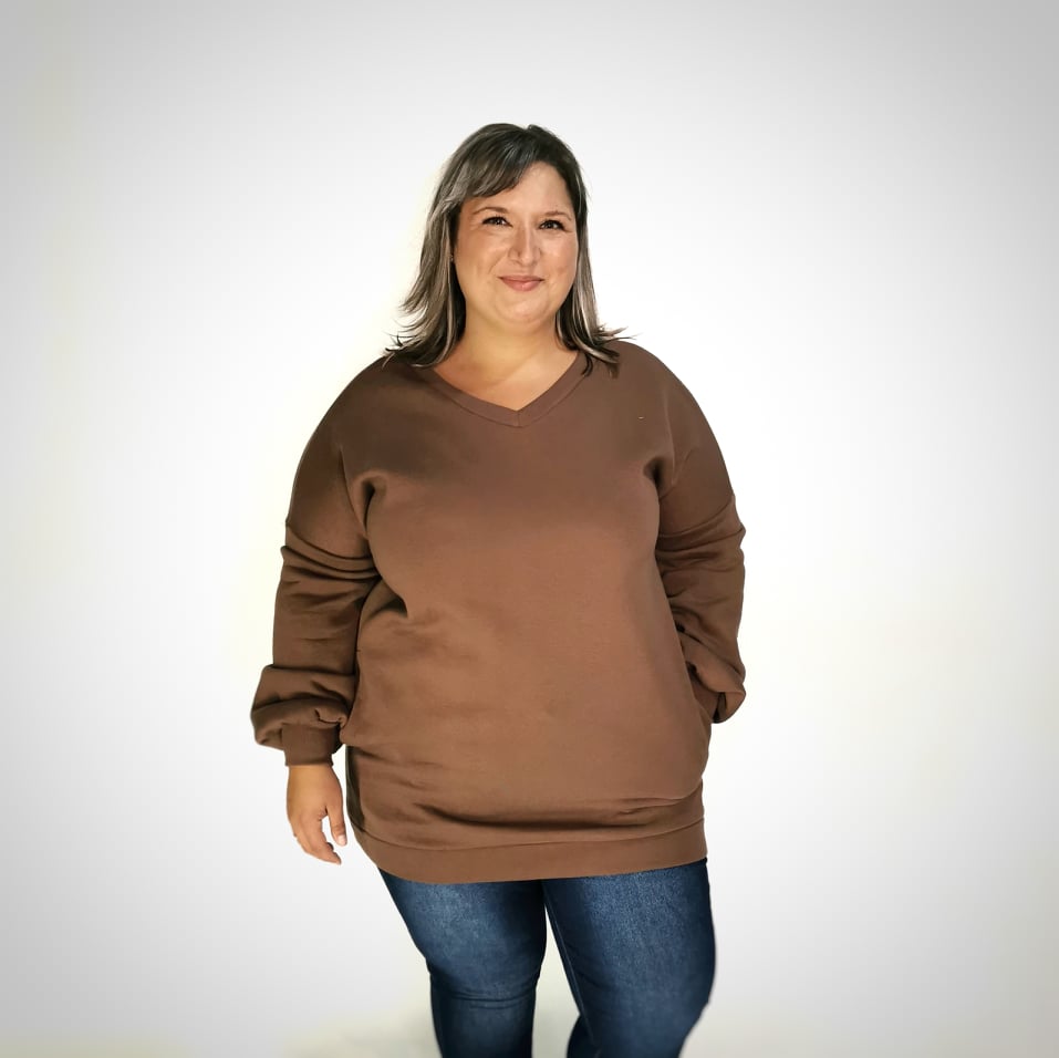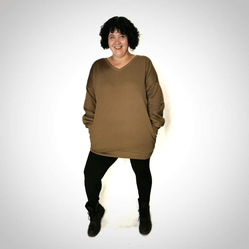 Description: Robe/ Chandail long en coton ouaté avec poches. N'a pas de capuchon.